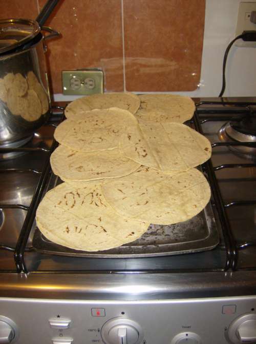For the main course she will shred the meat and then make some “taquitos dorados de pollo” (golden chicken tacos) with it. Normally those tacos are made with soft corn tortillas rolled with the chicken inside and then deep fried. We prefer cooking them without fat directly on a “comal” the traditional griddle used in all kind of Mexican cooking. Our stove even has one built-in that covers the middle 2 burners of the 6 burner stove top. You simply roll some shredded chicken meat in the soft tortillas and then place them on the very hot “comal” and turn them until they are evenly golden and crisp. She will serve the tacos with some homemade salsa and them with some heavy cream.
